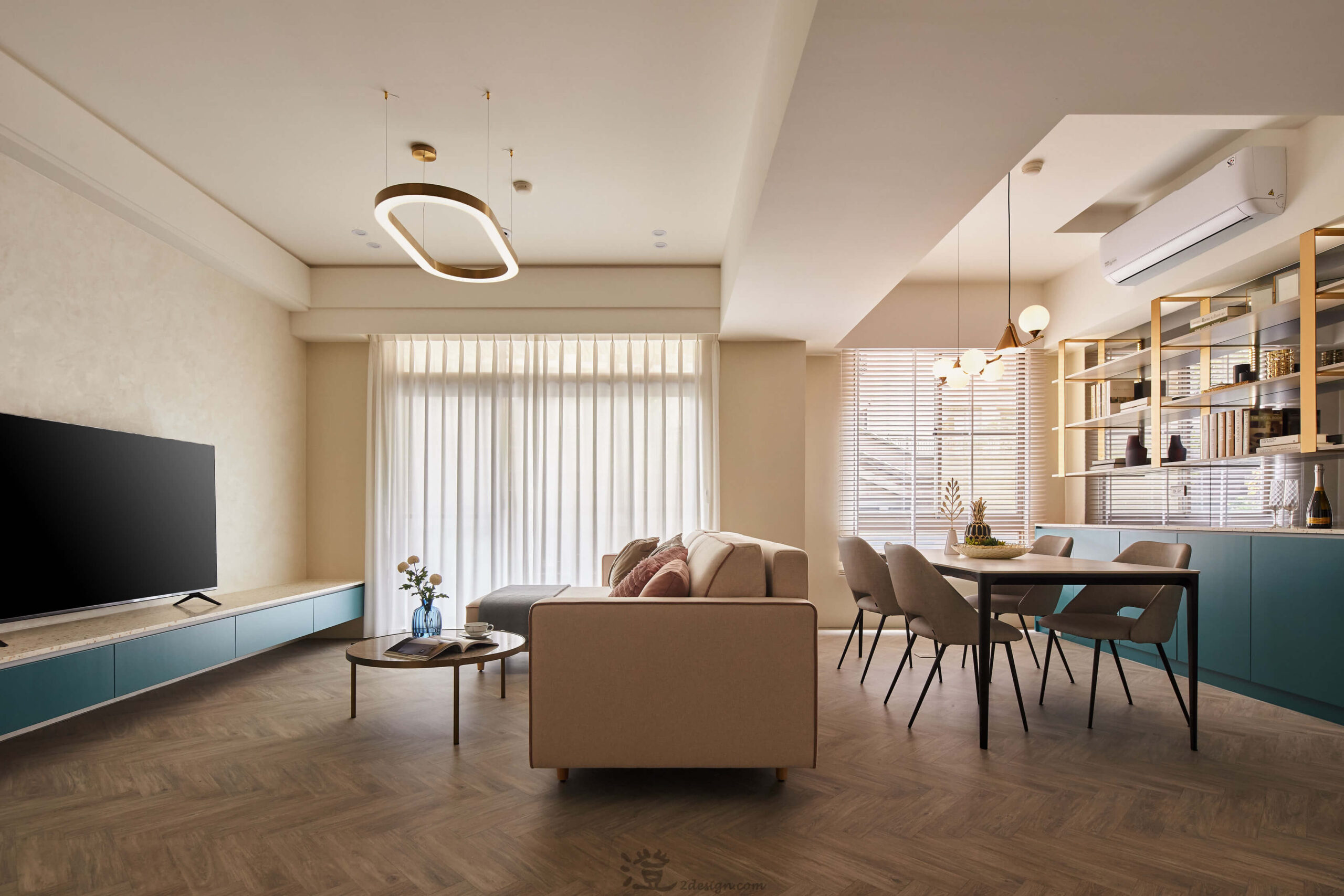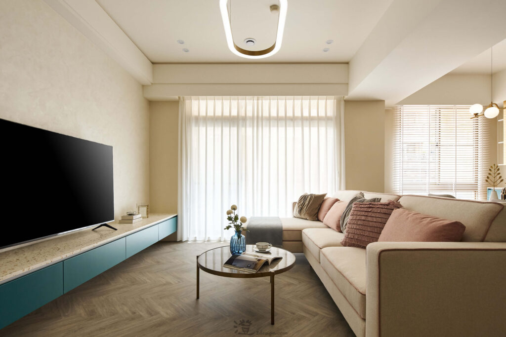 屋主喜好特殊的綠色,設計師將其融入空間中作為主視覺,並以淺色系、木質地板和金色元素烘托,呈現優雅簡約的現代質感,呼應屋主斷捨離的人生目標,客廳則使用綠色作為電視櫃佐以淺色水磨石和淺粉色系沙發,打造溫馨可愛氣氛。
