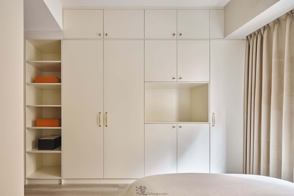 臥室以淺色系營造舒適休息氛圍,機能則依屋主生活習慣規劃,電視主牆結合衣櫃收納並在入口處設置開放式櫃體供屋主放置待洗衣物,床頭背牆則規劃結合化妝台的收納櫃與包櫃。