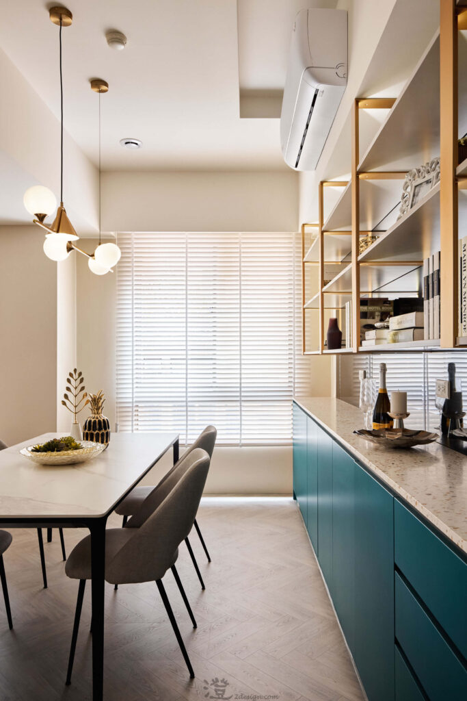 餐廳原本位置位於入口側邊,格局調整後移動至客廳旁,不僅採光變佳,空氣流通感和視野也提升,備餐櫃結合展示功能收藏屋主自釀酒及待客用酒品,呼應電視櫃以綠色和水磨石作為主體,點綴鏡面與金屬飾條,呈現精緻低奢感。