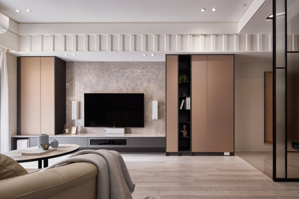 地材由拋光玄關的石英磚轉為超耐磨木地板,增添了更多放鬆的氣氛。 公領域中,入門玄關預留了更寬敞的地坪,玄關鞋櫃以懸吊式設計輕盈化量體,屏風取代高櫃或實牆,打造通透輕薄的隔屏,也讓客廳採光能暈染到落塵區。客廳左右兩側以霧金色烤漆電視櫃呼應木地板的色調,中央大理石悄悄植入現代風的奢華感,營造舒適,同時也兼顧到生活的收納機能。