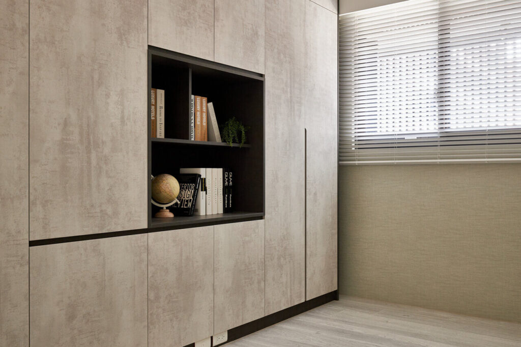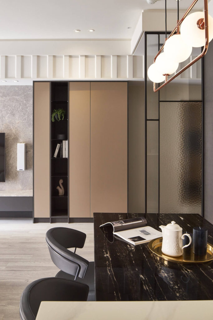 屏風後的用餐空間的大地色調增添了些許粉嫩感,在餐桌之外打造一座中島吧台,人造石檯面搭配玫瑰金餐燈,形塑精緻的用餐空間之外,也透過設計將「一起坐下來好好吃頓飯」變成一件重要而浪漫的事。三房其中的共讀書房延續公領域的大地色系,並利用仿清水模面板讓大座收納櫃在視覺上看起來更輕巧;櫃體中段的開放簍空創造櫃面變化,搭配黑色勾邊在機能之下豐富視覺。