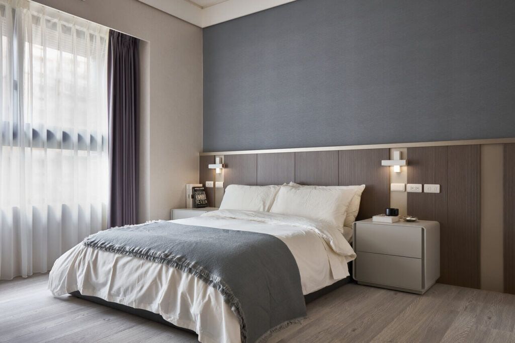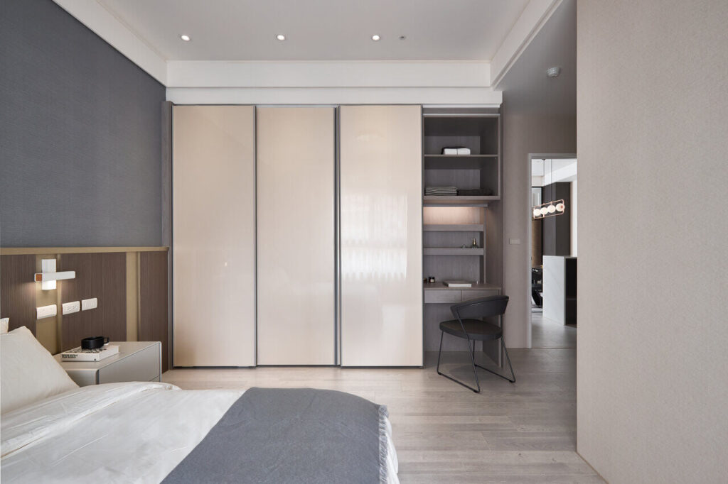 主臥房設計上寓美型於機能,床頭用莫蘭迪灰藍色壁紙創造比塗料更高雅的風格,床頭板選擇木質與地板圍塑溫潤的風格,邊框鑲嵌香檳金並搭配精緻床頭燈是,將飯店的奢華感帶入睡眠空間。房內貼心為女主人規劃的化妝台與衣櫃滑門連動,闔上時桌上的瓶瓶罐罐被遮蔽,替空間隱私升級!
