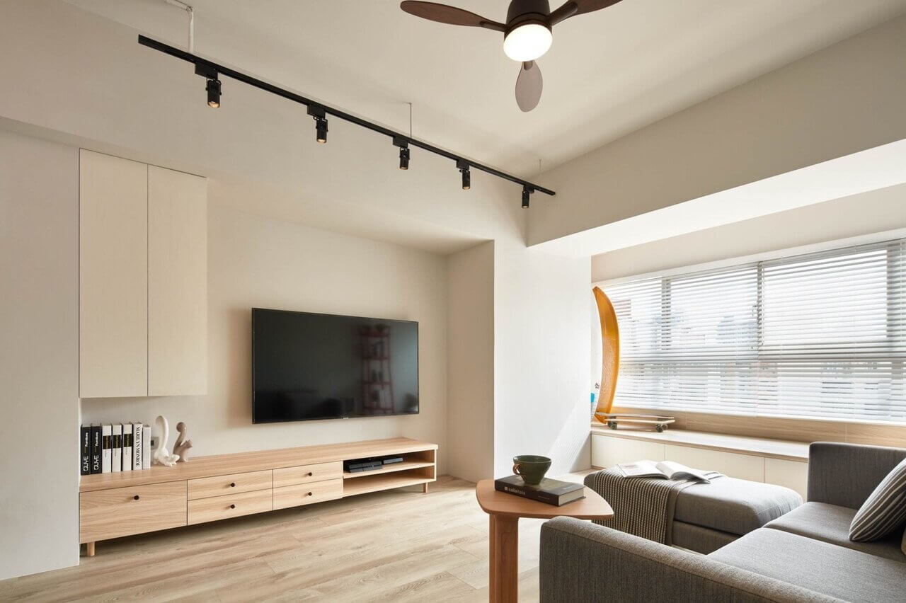 擁有優越採光的客廳將設計化繁為簡,清新木質調與白色基調,在窗邊規劃休憩臥榻,其餘的收納與沙發使用活動式家具,營造出空間彈性。