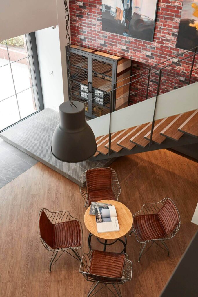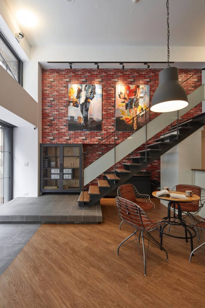 善用挑高空間打造大面積落地窗,並以大量鏤空鐵件彰顯俐落氣息,設計師更巧妙使用仿紅磚壁紙、仿清水模漆以及木紋塑膠地磚,大幅降低裝修預算,完成工業風格營造。