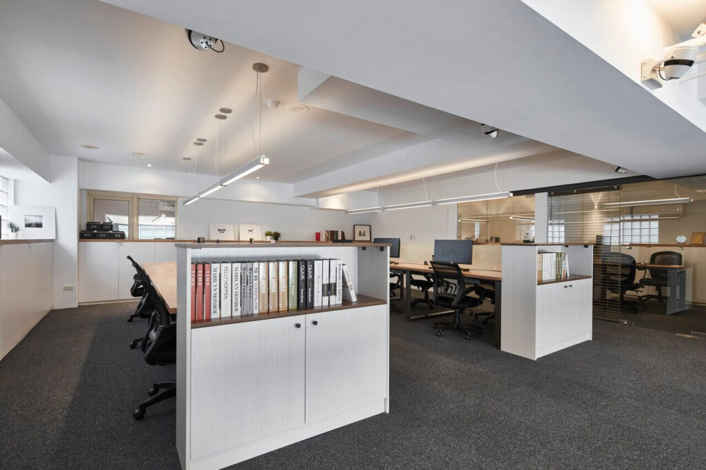 二樓以辦公空間為主,以開放設計與純白色調一掃傳統 OA 辦公的制式呆版,將有著通風孔設計的無印風置物櫃貼齊壁面,讓行進動線更加流暢,小型會議室的玻璃隔間更抹除狹小陰暗的可能性。