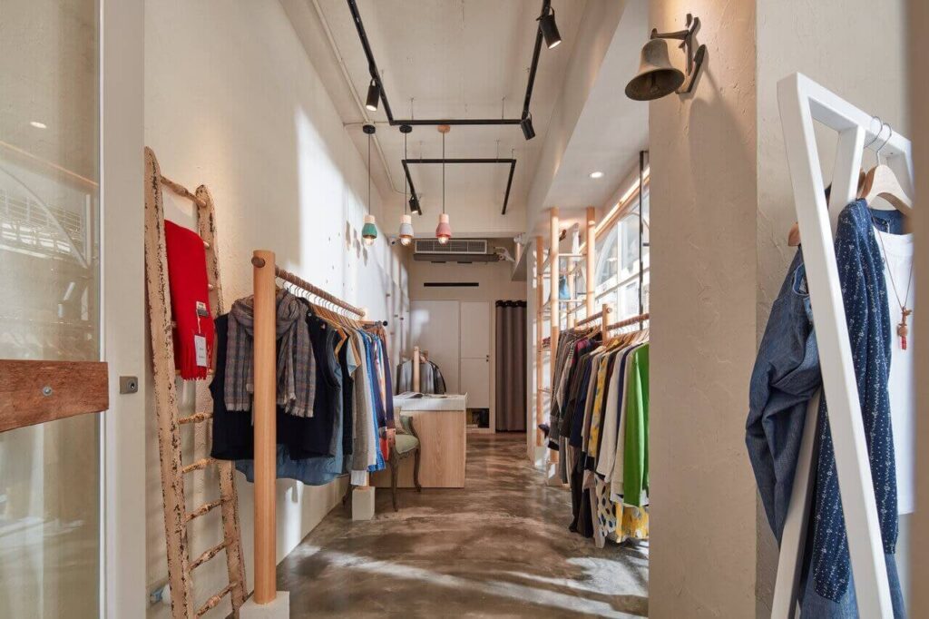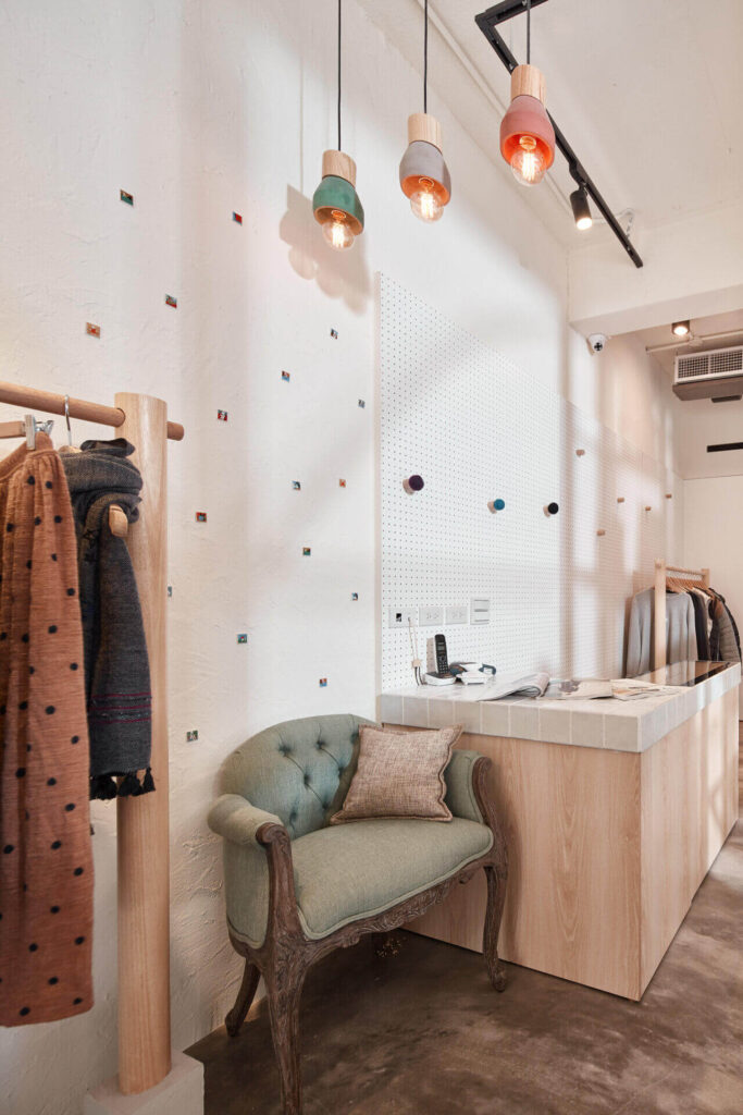因應狹長屋型,循序漸進地安排入口、展示區、櫃台、更衣間、儲藏室等場域,並沿著兩側配置吊桿架,創造延伸入內的順暢動線,且拆除原先天花降板,還原三米挑高尺度,中間懸吊三盞彩色泥磚吊燈,作為整體的中間段落、凝聚溫暖焦點;櫃台處更別出心裁地在牆面裝飾洞洞板與馬賽克磚,打造多功能展示立面。
