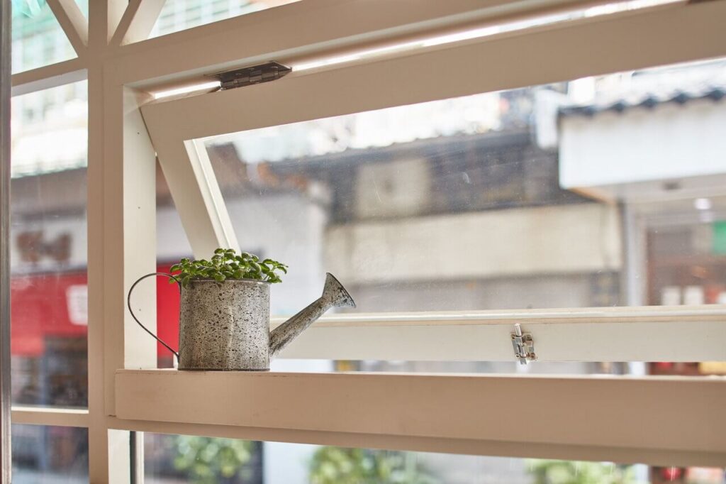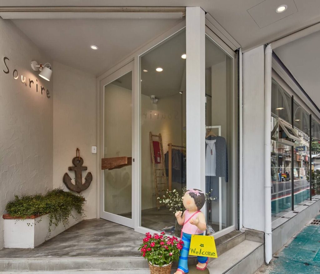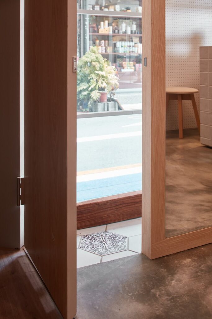 將既有門片位置向後退縮、設置台階,規劃入門處的三角區塊,作出場域緩衝,牆面則塗刷充滿手感痕跡的珪藻土,於地坪鋪敘水泥粉光,搭配立體不鏽鋼店名 Logo、鋁製海軍圖騰裝飾,佐以綠意植栽、烏心石實木門把等,將粗獷味與療癒感完美交融,同時考量到店面位於街道轉角,易埋沒於周邊建物、容易使人忽略,特意擺放一座彩色娃娃聚焦視覺、吸引路人注意力,刻劃出風格獨具的造景。