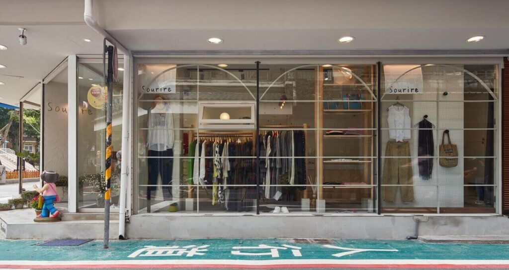 以大面積清玻打造櫥窗沿面,讓行經路人可一目了然瀏覽商品,並設計三座拱型流線、穿插兩道黑色鐵件立柱,增添櫥窗的線條變化性,靠左側則特別開一個小窗,不僅提供室內外空氣對流,更讓畫面顯得生動不呆板;燈光投射也充滿展示效果,入夜之後,店面於黑暗中有如發光燈籠,演出有別於白天的動人風情。