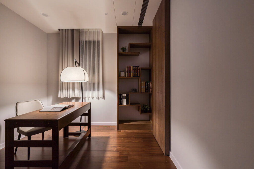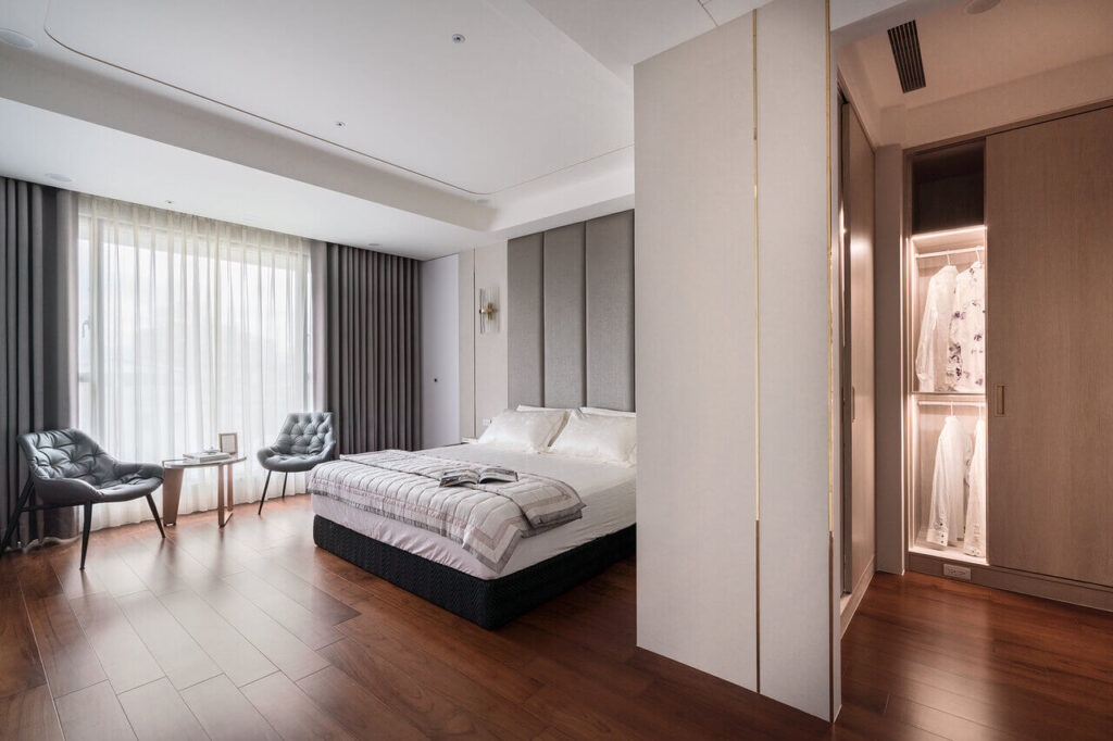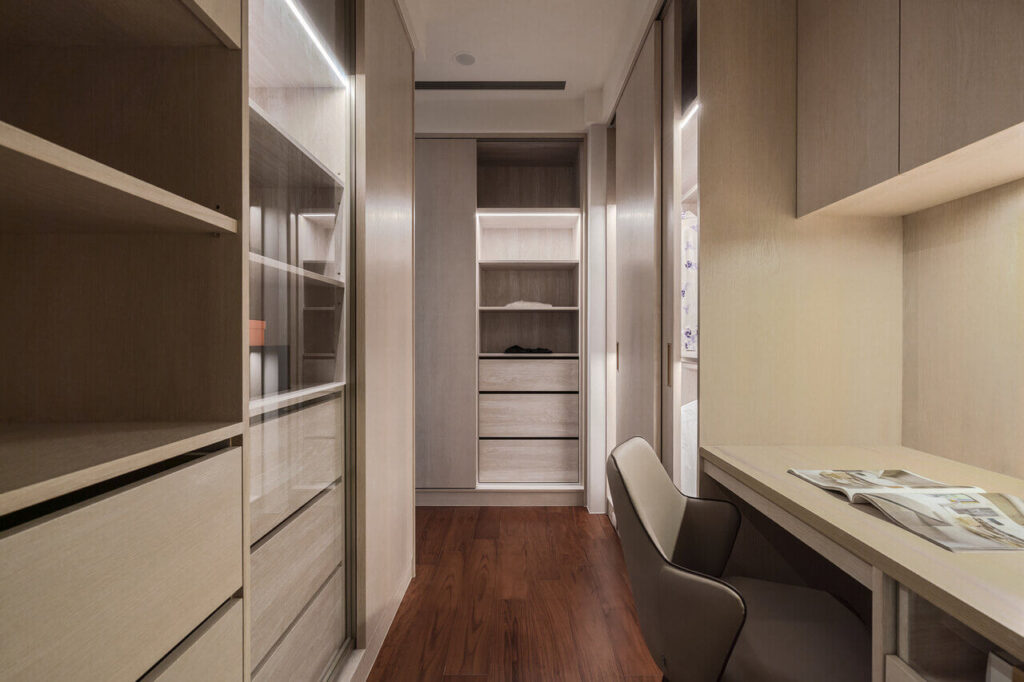 櫃體結合燈光,增添高級感。 寬廣的主臥包含寢臥區與更衣化妝間,衣物分門別類收納,巧妙的是將畸零空間設計成2個儲物間,也間接將房間格局拉正,空間感放大,輕淺色調與溫馨壁燈共同圍塑宛若高雅飯店的質感臥房。書房讓屋主靜心閱讀外,孫子來訪也能寫作業。