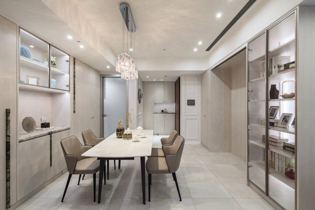 餐桌兩側落地櫃結合展示櫃,滿足海量收納的需求,連佛堂的空間都整合其中,整體感一致。收納櫃檯面特別將大理石嵌入櫃體及門板,細緻做工令人驚豔。