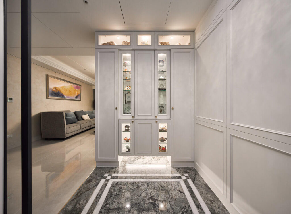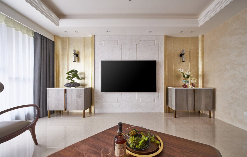 作為入門的第一印象,設計師在玄關處透過鞋櫃結合屏風的細膩手法,加上石材拼花地板的襯托,界定出氣度不凡的場域氛圍。客廳採取雪白的大理石妝點電視牆,呈現空間的高雅質感,石材上鏤刻的簡潔線條,則飽含成雙成對的美意;兩側弧形牆面鋪排細緻的金箔,搭配左右對稱的矮櫃,形成美感與機能兼備的特色端景。