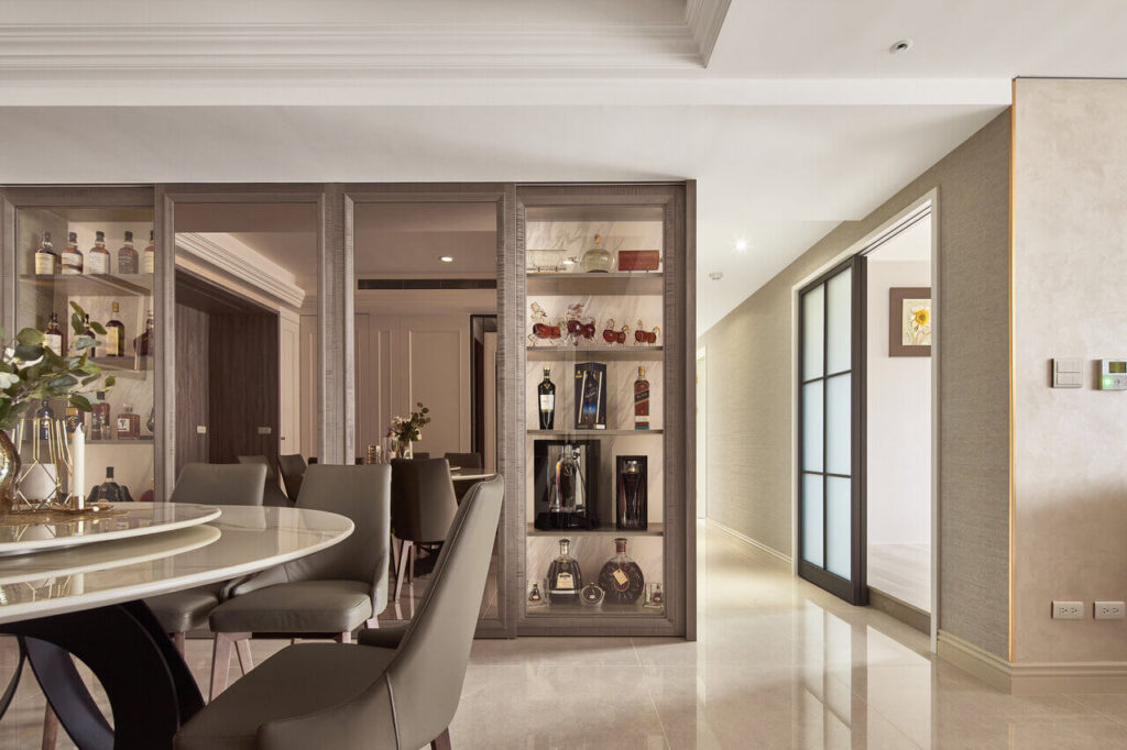 餐廳規劃一整面收納櫃,並在鑲嵌鏡面的拉門後方隱藏大量機能,延伸空間感的同時,也能俐落地收納各種雜物;兩邊的展示櫃則藉由柔和光源的烘托,擺放屋主的收藏品及酒類,讓生活與空間產生對話。