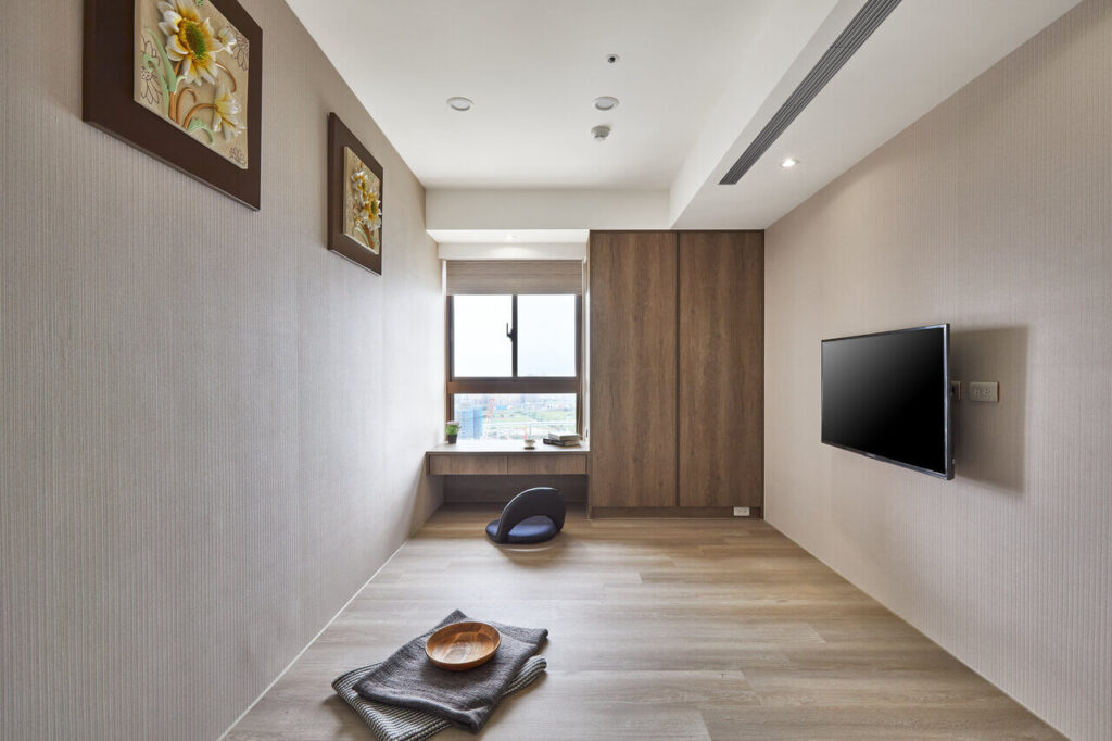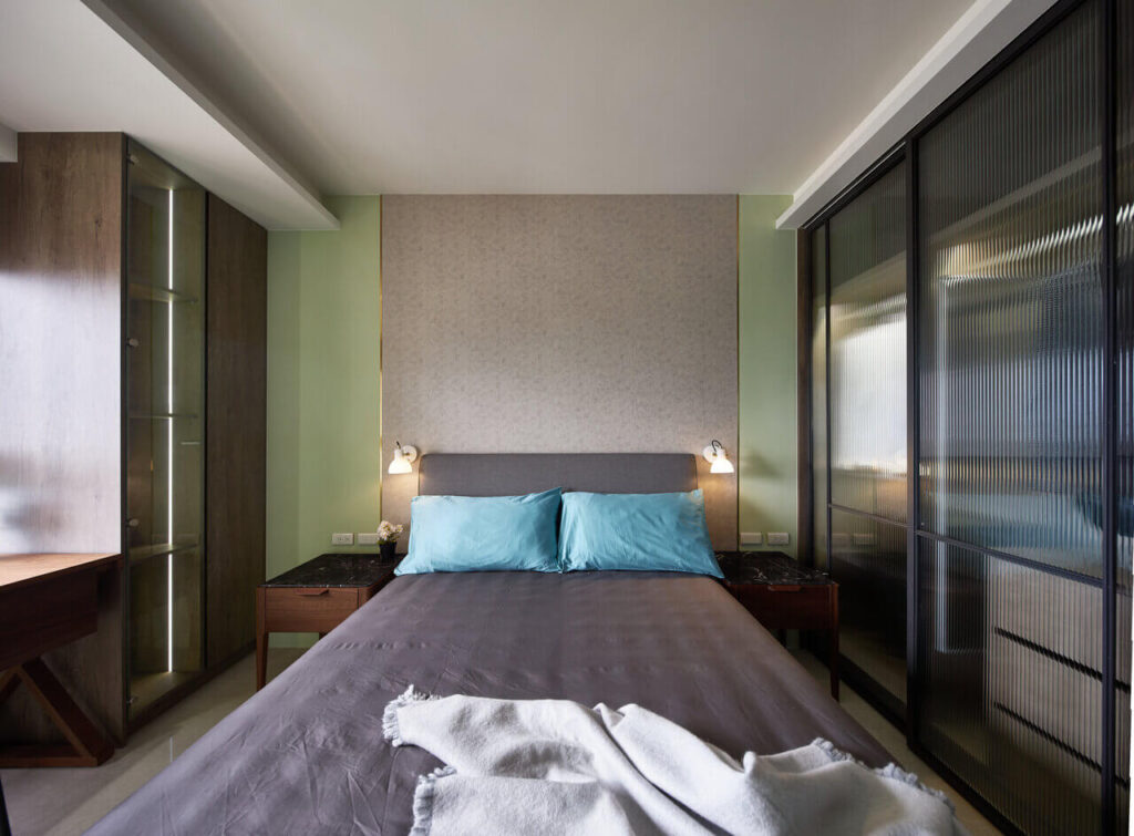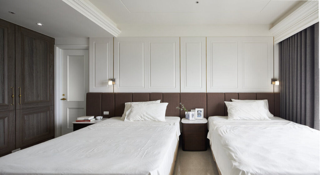 主臥選擇咖啡色繃布裝飾床頭牆,牆面上方的白色線板與床尾電視牆的木紋造型,皆呼應新古典的設計主軸,而雙床的貼心設置,則巧妙提升退休夫妻的睡眠環境。