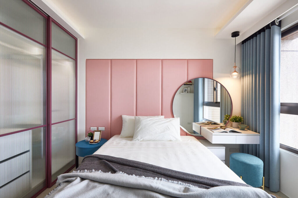 女兒房跳脫空間的低調奢華感,挹注粉色系的浪漫氣質,且於衣櫃採取玻璃門片,營造臥房的明亮開闊。