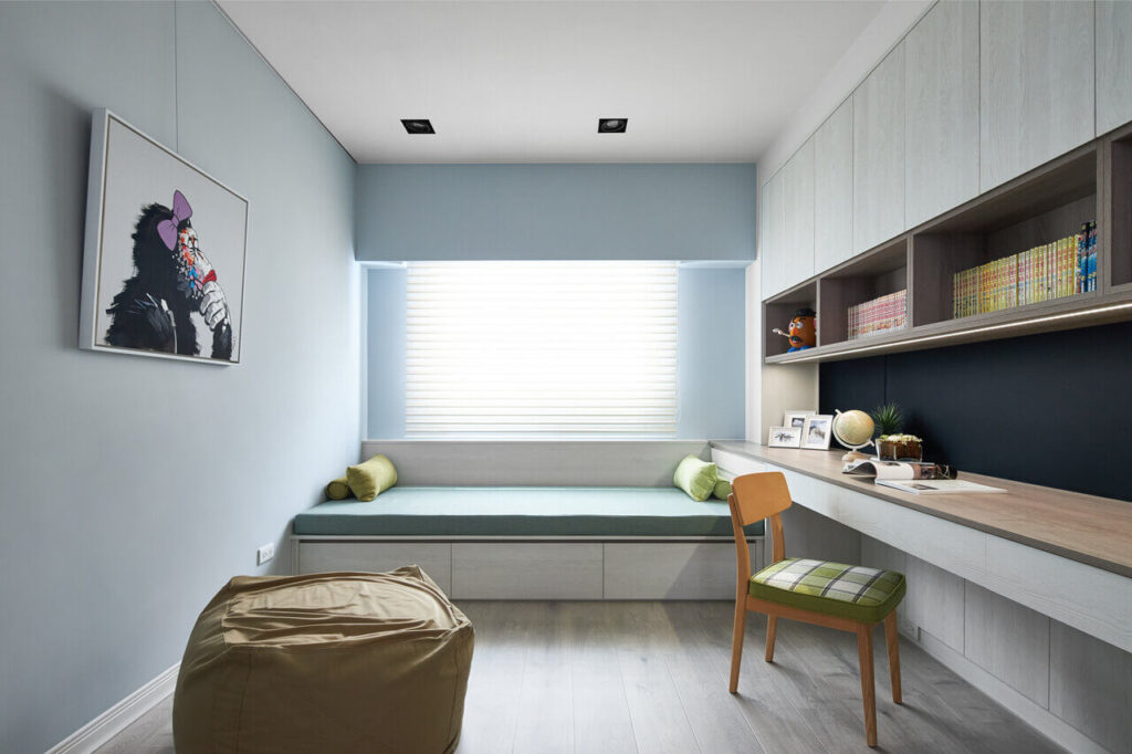 不需要考慮訪客需求以及預留小孩房,而是把整個 45 坪的室內空間都依照夫妻倆的需求進行訂製,把客廳規劃成專屬的