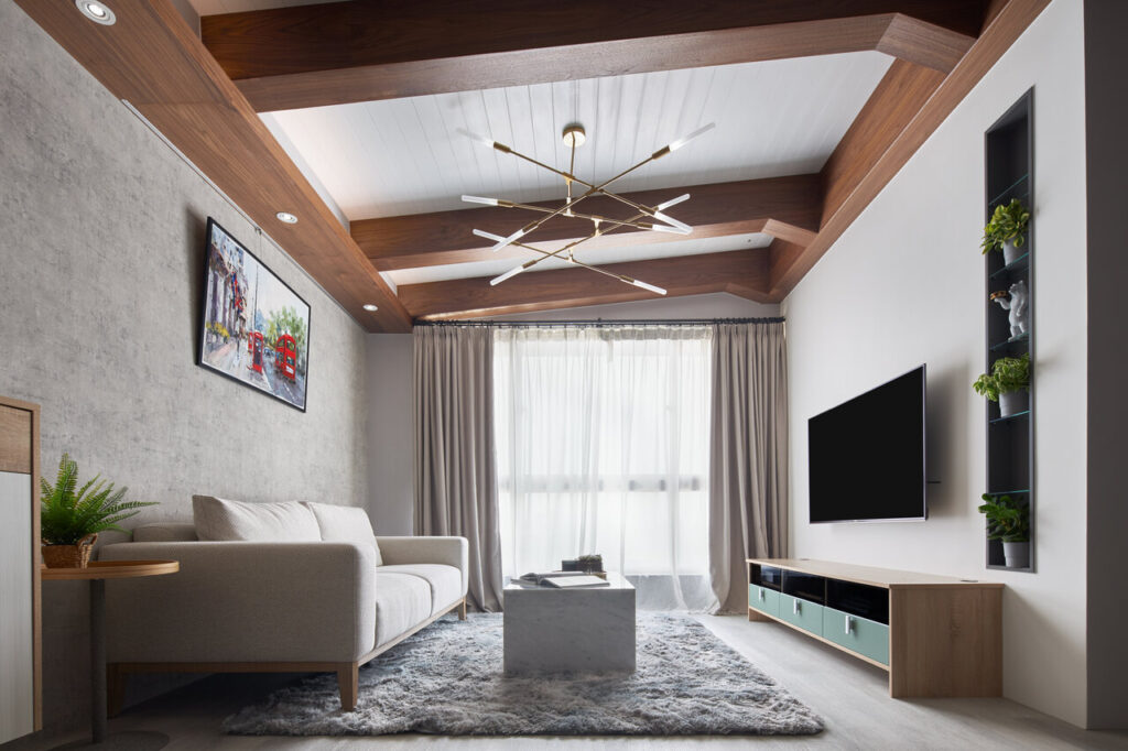 肺炎疫情之後,報復性旅遊頻出,在家工作也成了工作新型態。在此 24 坪的小小居宅裡, 於客廳打造鄉村風格天花板